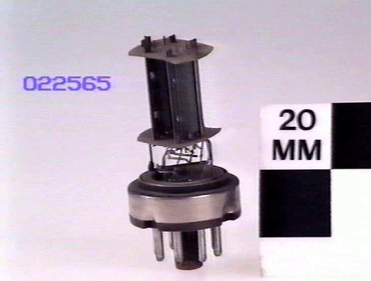 Internal parts of a valve made from metal and mica mounted on octal base (brown material) and plated shell mounted on display block with a complete example of a similar valve ST 022564.