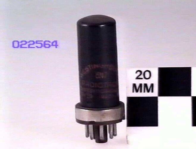 Tubular metal envelope painted black with octal base (brown material) and plated shell mounted on display block with a sectioned example of a similar valve ST 022565.