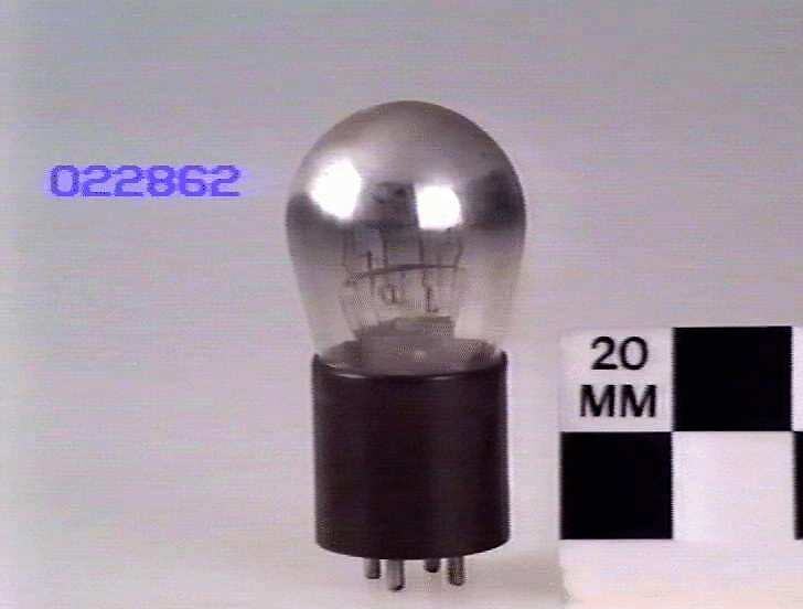 Two valves on a wooden display block, with labelling. Valve No.1: Conical glass bulb with American style short 4 pin (UV) base mounted on display block. Valve No.2: Tubular glass bulb on small diameter (UV199 style) 4 pin base with metal shell.