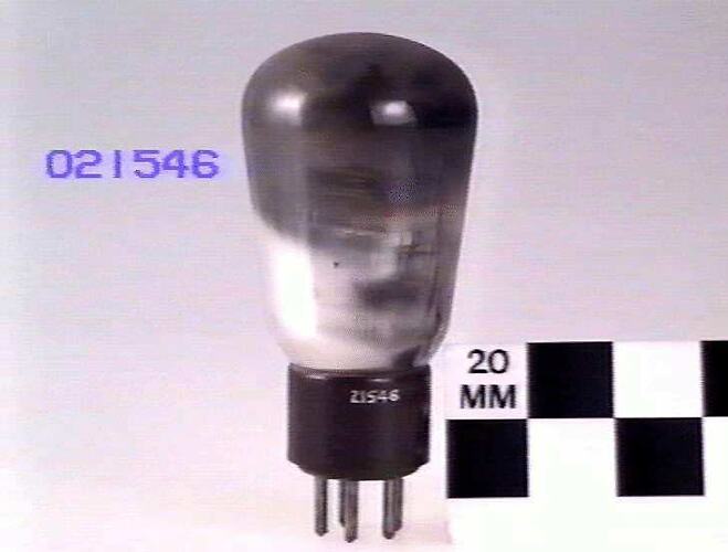 Conical glass bulb with American style 5 pin (UY) base mounted on display block with a sectioned example of the same type of valve (ST 021555).
