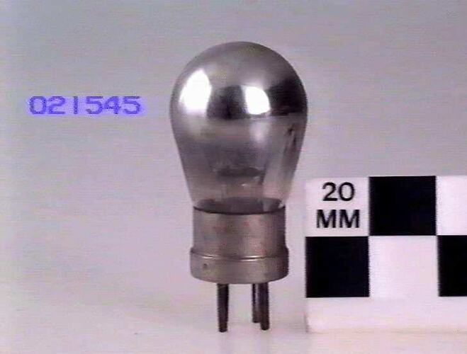 Conical glass bulb with European style 4 pin base with metal shell mounted on display block with a valve of the same type (ST 015931) with its bulb removed.