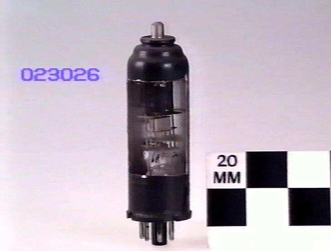 Metal sheathed valve sectioned to show the conventional glass internal structure. It has a top cap and octal base with 7 pins present. Painted black. Mounted on display block.