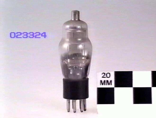 2. The 2B7 and 6B7 were the first double diode pentodes to be made, combining the functions of IF amplifier, signal detector and AVC rectifier in the one valve. The pentode section has a semi-remote cut-off characteristic. 2.5 V indirectly heated cathode. Manufacturer: Hygrade-Sylvania Corporation, PA, USA.