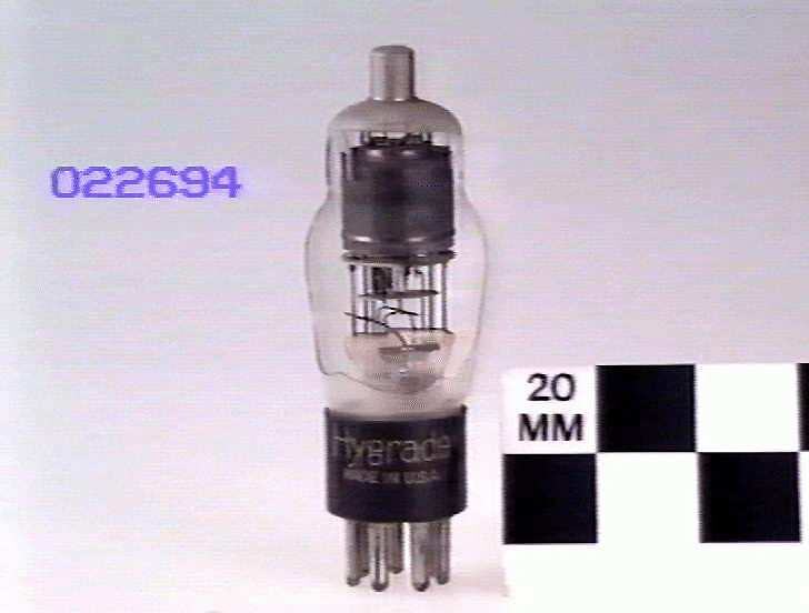 Shouldered glass bulb with top cap and American small 7 pin base, sectioned to reveal the internal structure. Mounted on display block with an intact example of the same type of valve.