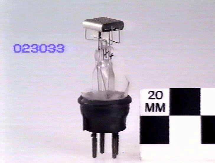 Glass bulb mostly removed with European style 4 pin base mounted on display block.
