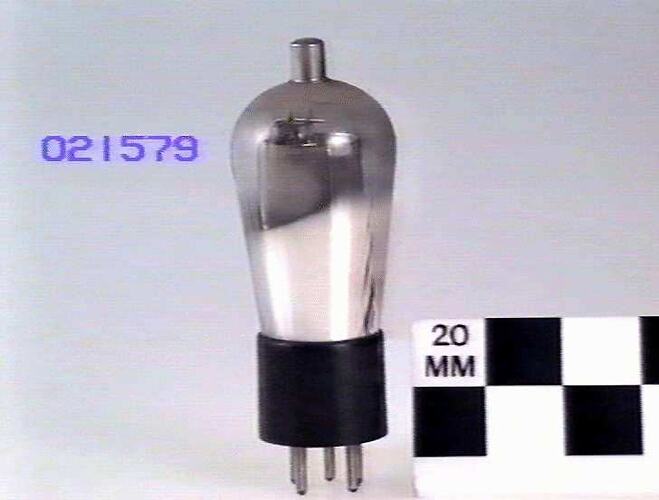 Conical bulb on five pin UY style base with top cap, mounted on display block with ST 21580.