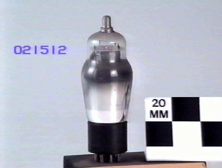 Shouldered glass bulb with top cap and octal base. Mounted on display block.