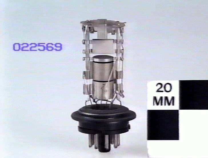 Sectioned one inch cathode ray tube with electrostatic deflection. 6.3 volt indirectly heated cathode.