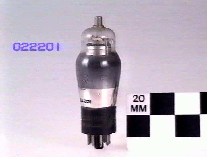 Shouldered glass bulb with top cap and octal base. Mounted on display block.