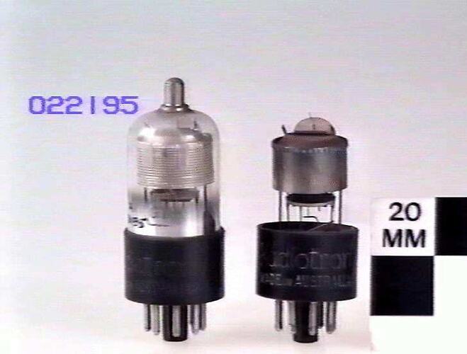 Valve # 1: Bulb: 1P5/GT Base: Radiotron/MADE IN AUSTRALIA Display block: Description, Basic data and donor's name. Valve # 2: Base: Radiotron/MADE IN AUSTRALIA Display block: Description, Basic data and donor's name.
