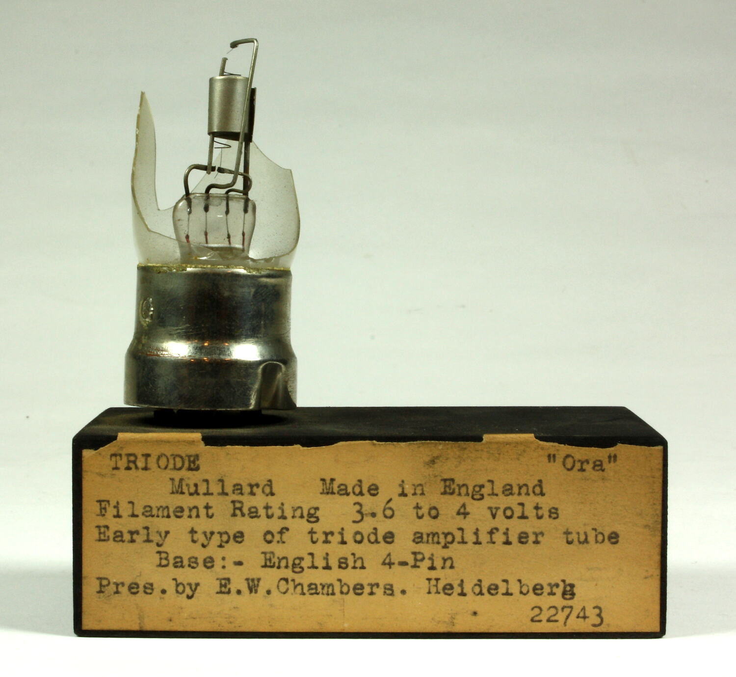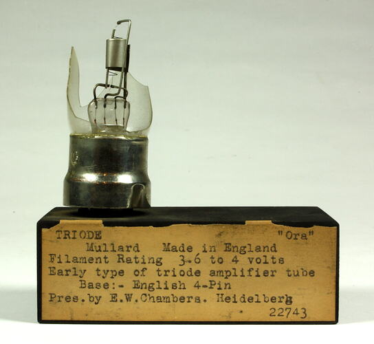 Typescript text on display block label: 'TRIODE "Ora" / Mullard Made in England / Filament Rating 3.6 to 4 volts / Early type of triode amplifier tube / Base:- English 4-Pin / Pres. by E.W. Chambers. Heidelberg / 22743'