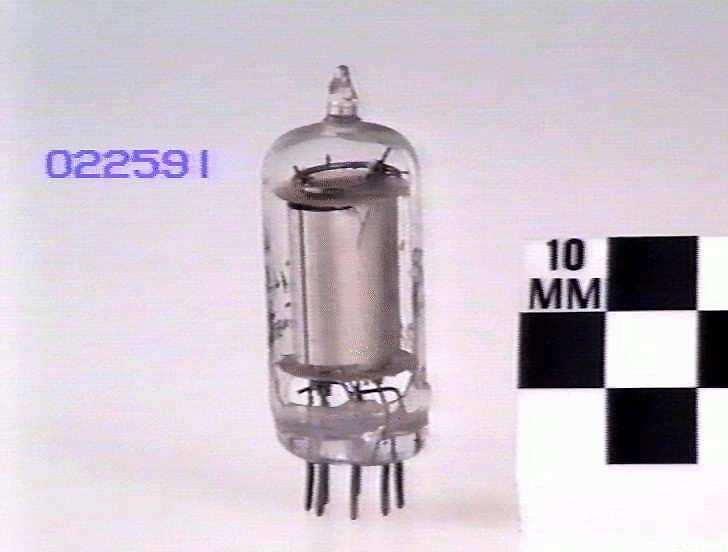 Sectioned tubular glass bulb with miniature 7 pin button base. Mounted on display block.