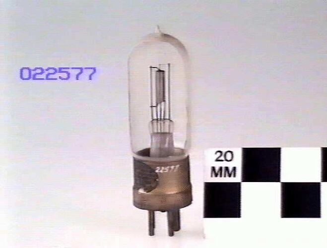 Later versions of this valve had a shorter bulb and the valve socket of the Aeriola Senior radios was moved closer to the front panel to accommodate this. The long bulb versions such as this could not be used in the later sets because they were broken when the lid was closed.