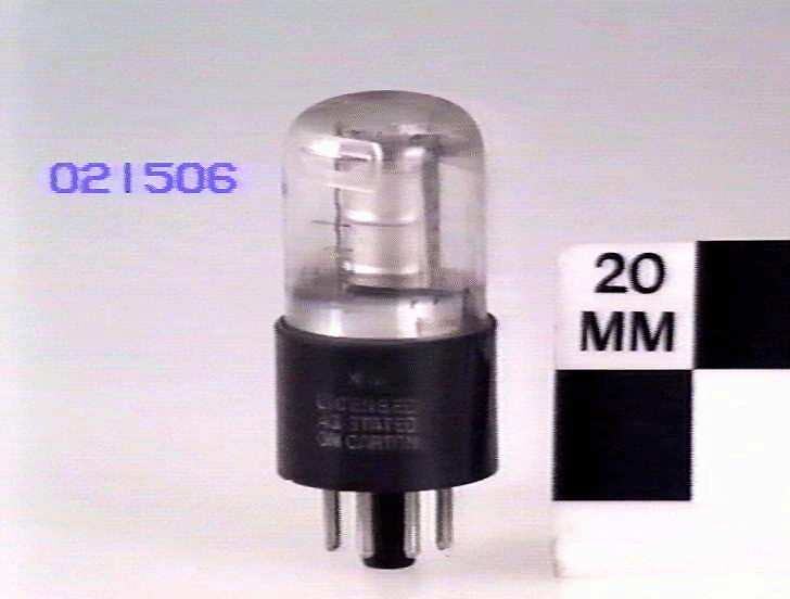 Tubular glass bulb. Octal base with 7 pins present. Mounted on display block.