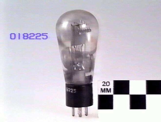Conical glass bulb with American 4 pin (UX) base. Mounted on display block with another example of the same type with its bulb removed (ST 21536).