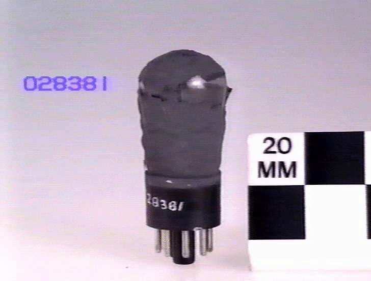Small conical glass bulb with seven pin octal base. Zinc screening coating is flaking off taking with it, most of the type number.