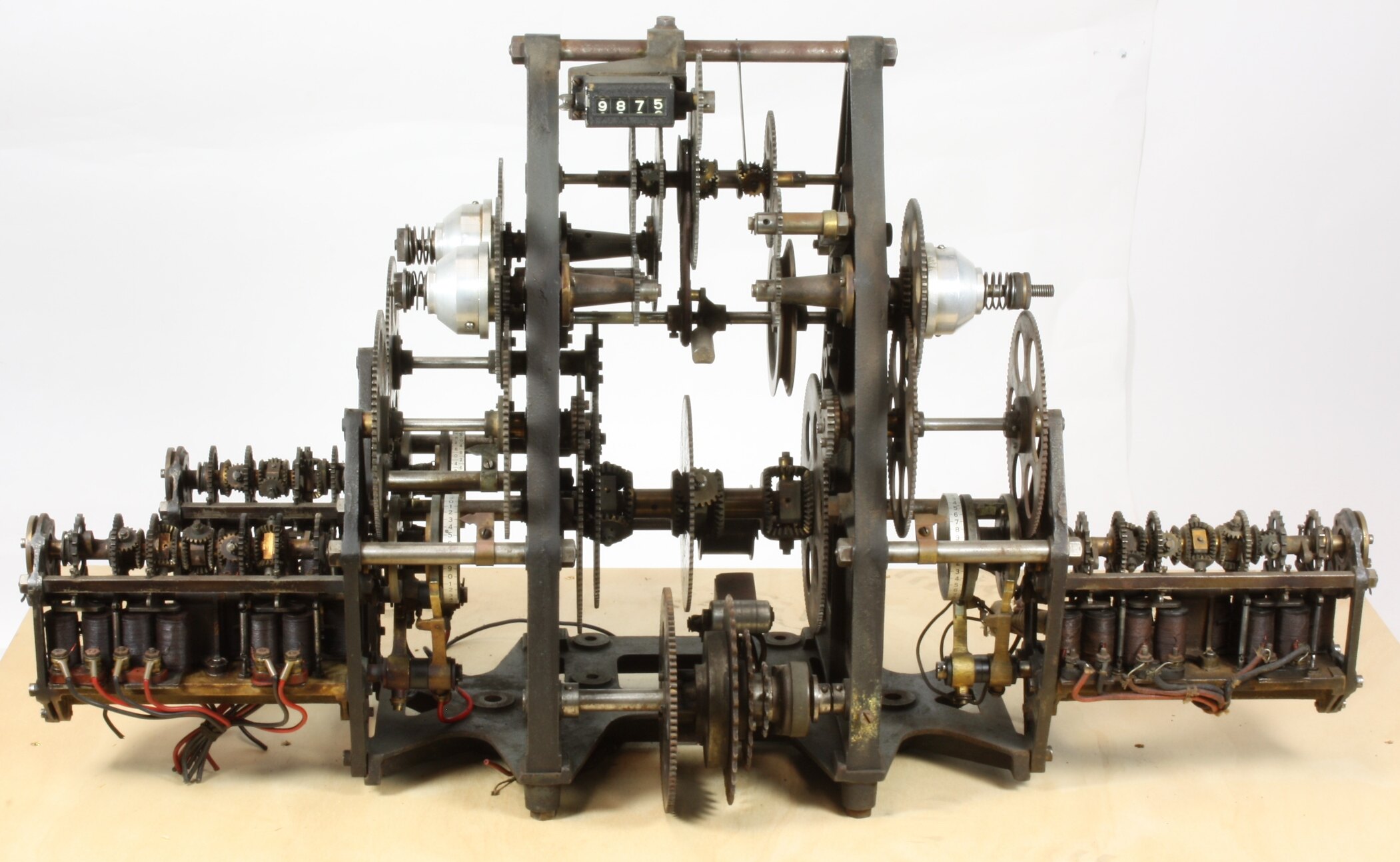 Mechanical calculating system; consists of a main differential gear box, connected to 3 smaller ones by 3 clutch mechanisms. Small differential gear devices are activated by 16 solenoids separately wired. 3 round dials indicate number of inputs which are combined and displayed in the top centre counter.