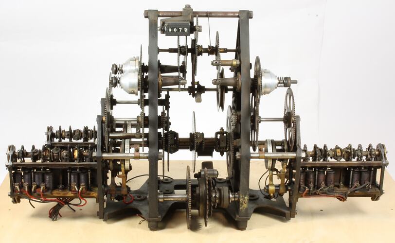 Section of gearing from a totalisator installation. Believed to be part of the first Melbourne totalisator, 1931. The automatic totalisator was invented by George Julius, and the first one was installed at a New Zealand racecourse in 1913.