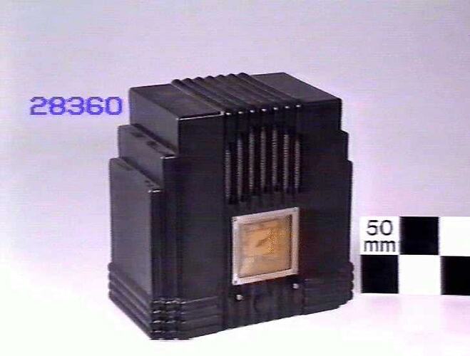 A.W.A. Fisk Radiolette radio receiver, model R29, upright mantle pattern with bakelite case, with original guarantee card and instruction booklet. Made by Amalgamated Wireless (Australasia) ltd., in Australia, about 1935.