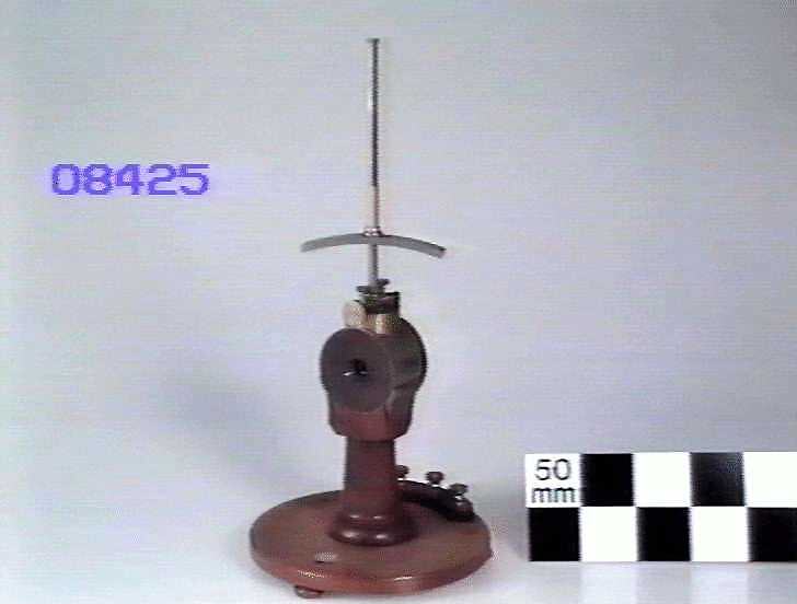 Circular wooden base with central wooden column supporting horizontal brass cylinder with ebonite (?) end plates. Vertical brass rod above cylinder, supporting curved magnet. Brass and steel components. Four brass terminals on wooden base.