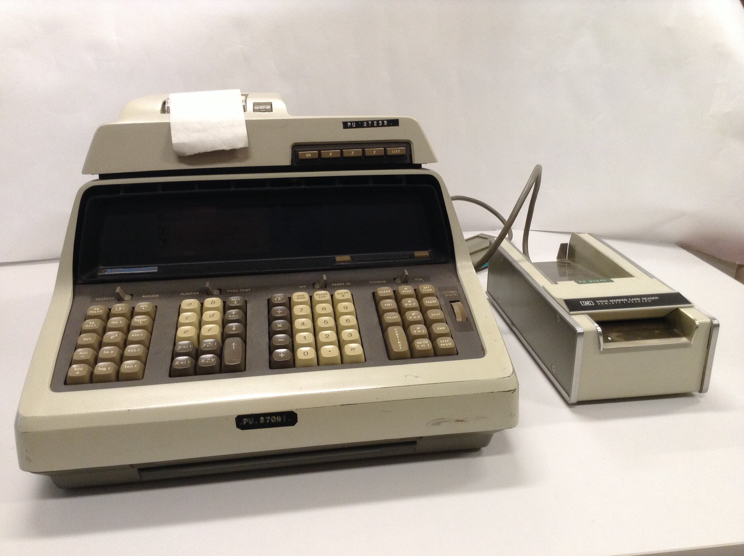 Computing Calculator: Beige metal unit with rounded edges with grey and brown keyboard and digital screen at front, plastic feet on base and plug connections at rear. There are pull-out instuction on a panel at the front. It has been labelled with black Dynamo labels. Printer unit is physcially attached at top. It has a light grey plastic cover with white edging. Printer: Curved beige plastic unit with dark grey buttons at front, paper reel (with paper) on top and connection cords at rear. Two cracks on right hand side of rear of unit. It has been labelled with black Dynamo labels. Physically attached to top of calculator unit. Marked Card Reader: Rectangular metal unit painted beige with plastic feet on base and sloping silver tray on top. There is a grey connector cord at the back of the unit. It has been labelled with black and green Dynamo labels. There are two beige plastic cassettes for Program Cards.