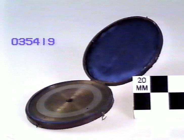 Circular slide rule, brass with steel movable scale, in maroon leather case, made by Kilpatrick & Co., London, circa 1870, and used at Melbourne Observatory.