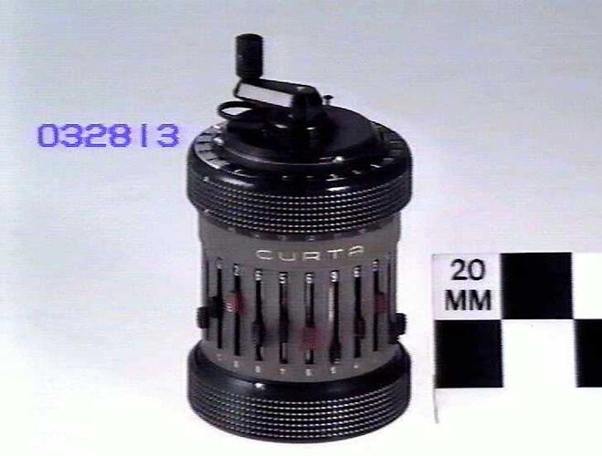 CURTA mechanical calculator. Model II. Made by Cortina AG. Mauren, Vaduz in Liechtenstein, 1966. The CURTA 'pepper-grinder' type mechanical calculator was re-designed from memory by Curt Herzstark while he was a prisoner in Buchenwald concentration camp during World War II from his 1938 Austrian patent. The first example was manufactured in Liechtenstein in 1947. The eleven 0-9 sliders on the side are input figures and sight holes in the top provide a readout. Calculations are performed by the rotating handle and/or the rotating top of the drum. The CURTA can perform addition, subtraction, division, roots, squares and many other calculations. The retail price in 1966 for this model was US$120.00 in a metal carrying case.