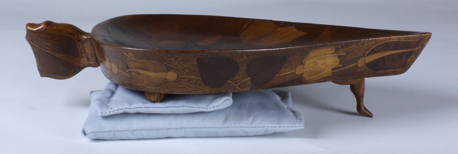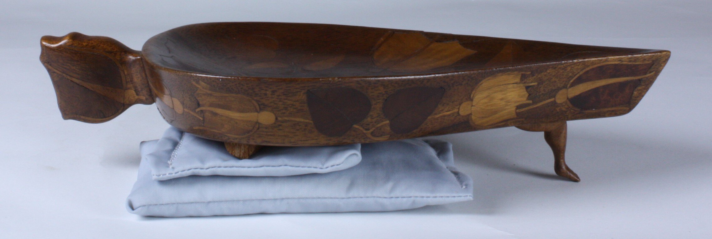 Leaf shaped bowl with 3 legs shaped as human legs probably made from Blackwood (acacia melanoxylon) (leguminosae) for bowl, Native Cherry (exocarpus cupressiformis) (santalaceae) for legs inlay shows native flowers made from Native Cherry & Blackwood (acacia melanoxylon) (leguminosae). Made by Edwin Ault within the period 1900-1950.