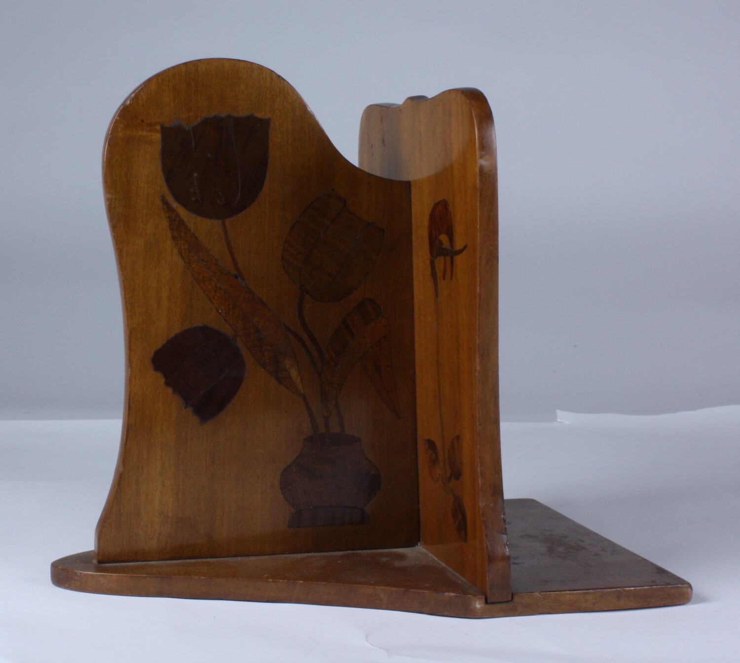 Parquetry book ends. Each book end has 3 sections, base, upright, brace. These are made of Native Cherry (exocarpus cupressiformis) (santalaceae), inlays include Blackwood (acacia melanoxylon) (leguminosae) for leaves, sapwood from Native Cherry for flowers. Made by Edwin Ault within the period 1900-1950.