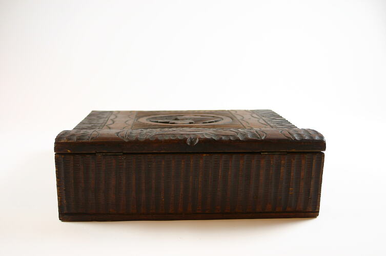 Portable wooden writing desk with carved floral design, it is divided into two compartments one for paper and one for ink and pens.