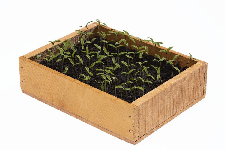 Rectangular wooden box containing imitation soil and healthy looking model seedlings.