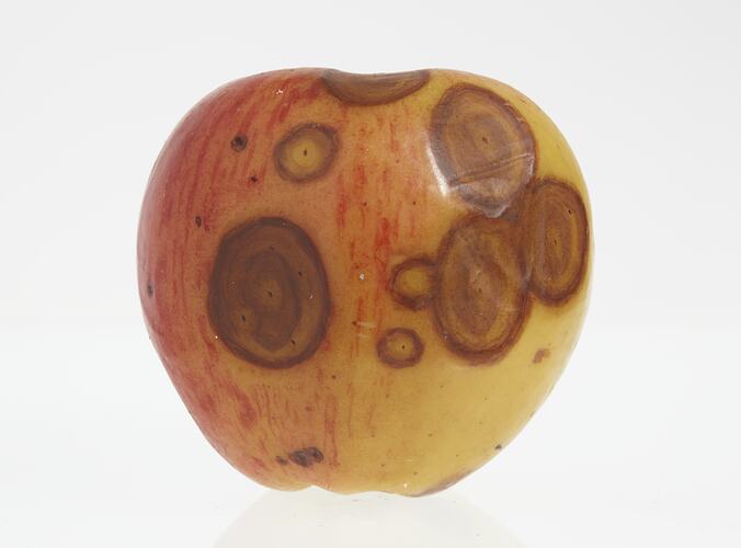 Wax apple model based on specimen from Victorian Department of Agriculture, modelled in the museum by model maker, Joy Dickins on 11 October 1949. The model depicts an delicious apple with the disease target spot (Causal organism: Gloeosporium album (Melanconiaceae)).