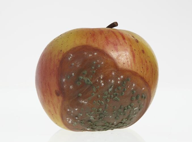 Wax apple model based on specimen from Victorian Department of Agriculture, modelled in the museum by model maker Joy Dickins on 6 December 1951 The model depicts a Rome Beauty apple with Blue Contact Mould (Penicillium italicum (Moniliaceae).