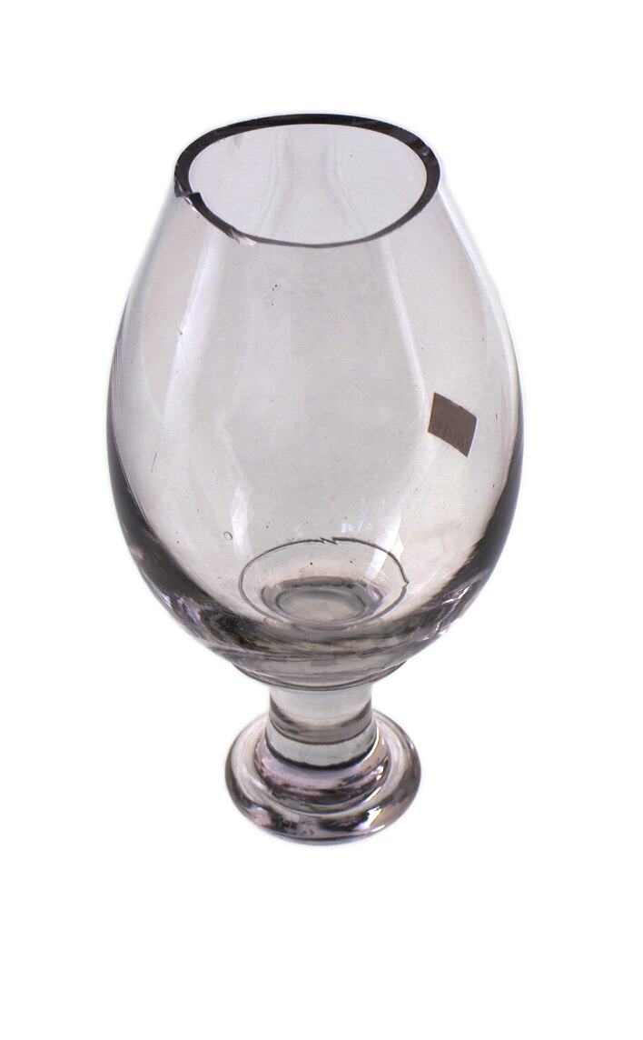 Stage 2 of a partially formed body and stem of a wine glass. Made of clear glass. The rim is jagged.