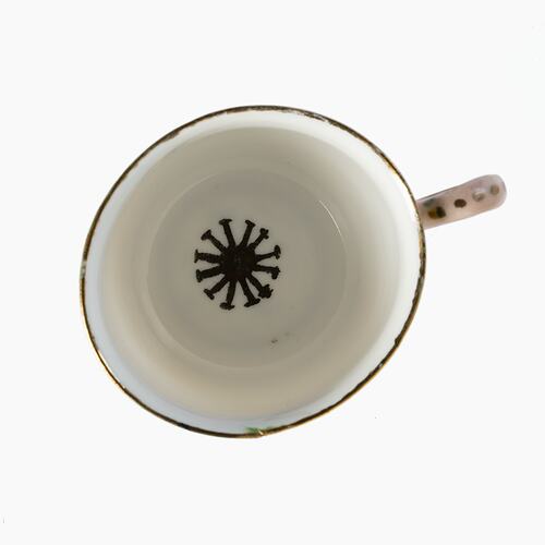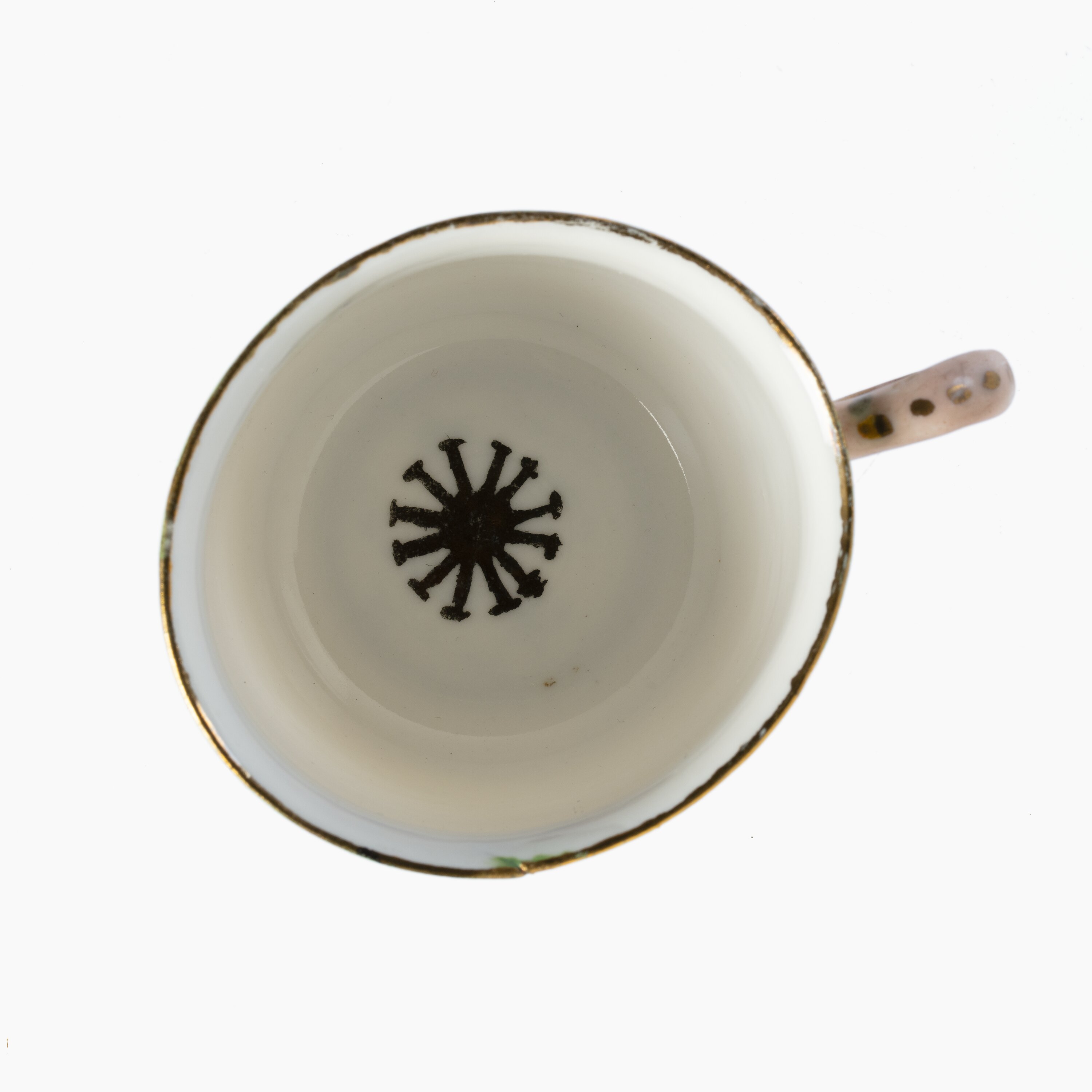 White porcelain tea cup with edge painted scalloped green with pink detail and gold trim. Inside tea cup is painted a sun with 12 rays in gold. Inscription on base of cup written in gold paint.