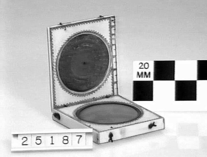 The upper lid contains a horizontal sundial for latitude 50 degrees north (the latitude of northern France). When the lid is opened a pivoted metal arm enables the user to set the lid at any altitude, by the scale inside the lid, thereby creating an equatorial sundial. The underside of the lid contains a rotating disc, which provides the approximate time of the Moon's transit in accordance with its age. The inside box gives a list of French towns and their latitudes, the cardinal directions, and a compass marked with hours as an analemmatic dial.