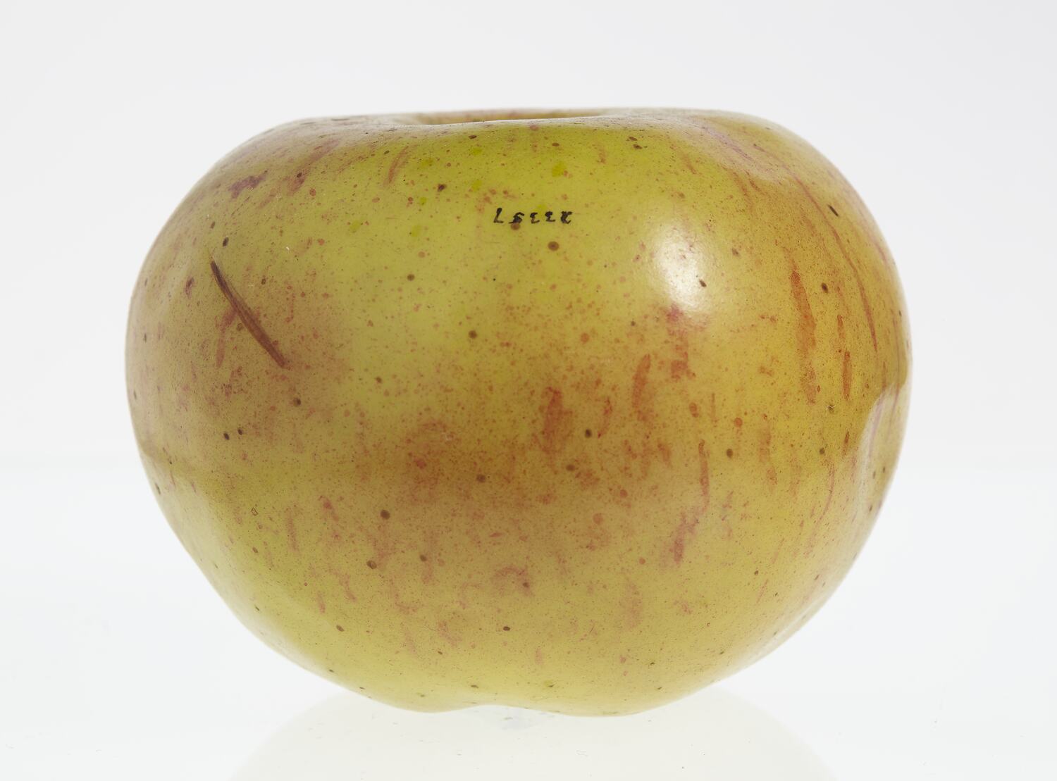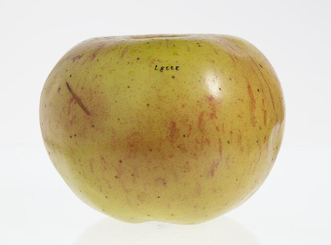 Wax model of a large apple with a short stem, painted yellow-green. The apple has red marks and a 2cm long brown mark on the underside.