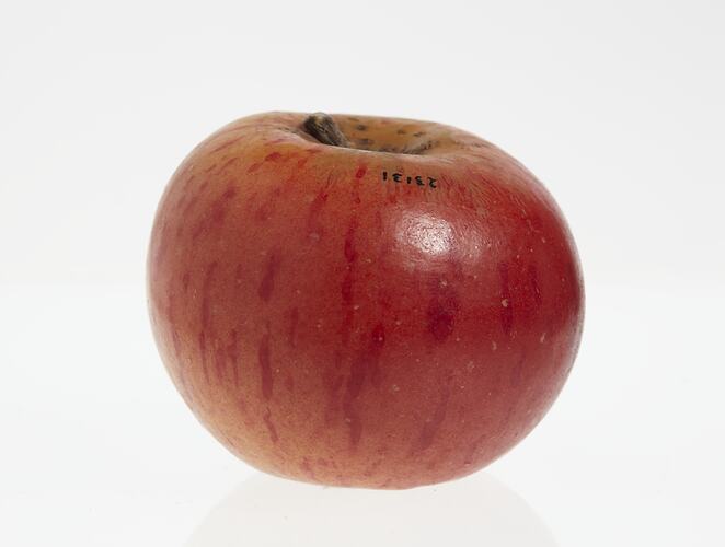 Wax model of a small apple with a short stem, painted red and orange. The apple has brown scuff at the top and the base.
