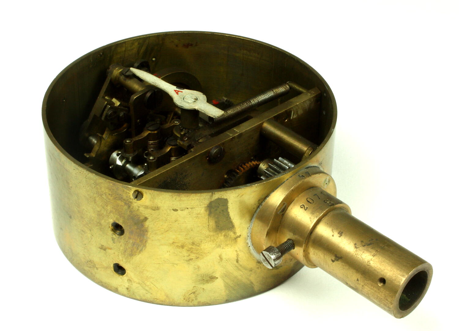 Cylindrical brass body, designed to be vertically with a stem tube attached at the bottom. A flexible revolving shaft driven by the engine crankshaft would originally have been connected to the instrument through the stem tube. The internal mechanism mounted on a rectangular brass plate can be removed from the body. The mechanism includes a spiral spring driven clockwork element, centrifugal governor and three circular tumblers with gear teeth around a portion of their perimeters. A rotating pointer or needle arm, painted white, originally indicated the engine revolution speed against a the circular scale on a dial, which is now missing.