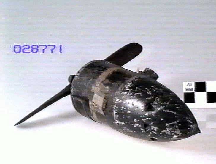 Wooden propellor (missing section of wood). Round metal casing, tapering at rear to a pointed nut, Four small round cooling air vents (with mesh filters) in casing at front and cut outs for air outlet in tapered section at rear. Paint scraped off in several places. Dent in tapered section. Electrical connector with internal thread. Two manufacturer's plates.