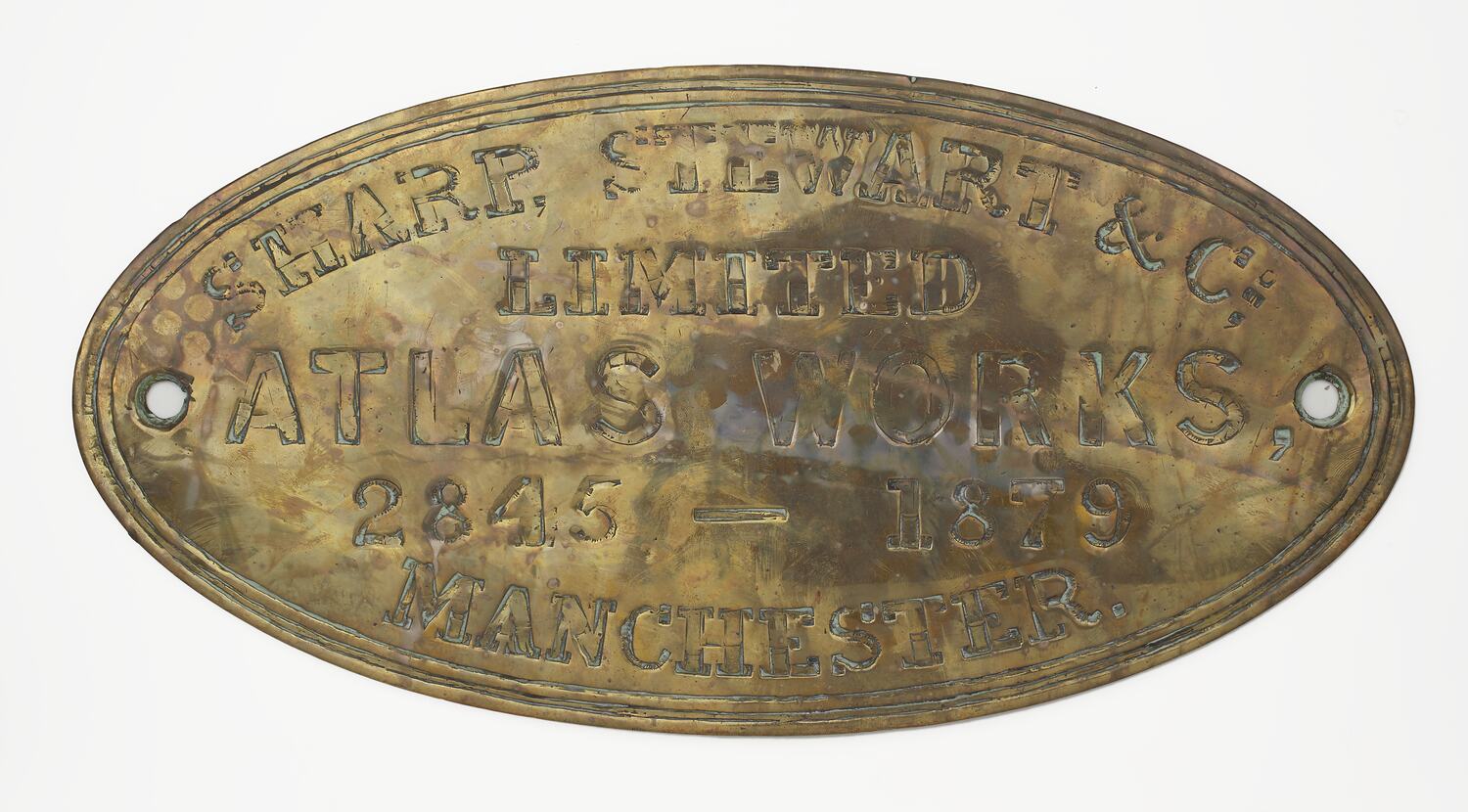 Brass oval locomotive builders plate, No 2845, manufactured by Sharp, Stewart & Co Ltd., Atlas Works, Manchester, England, 1879.