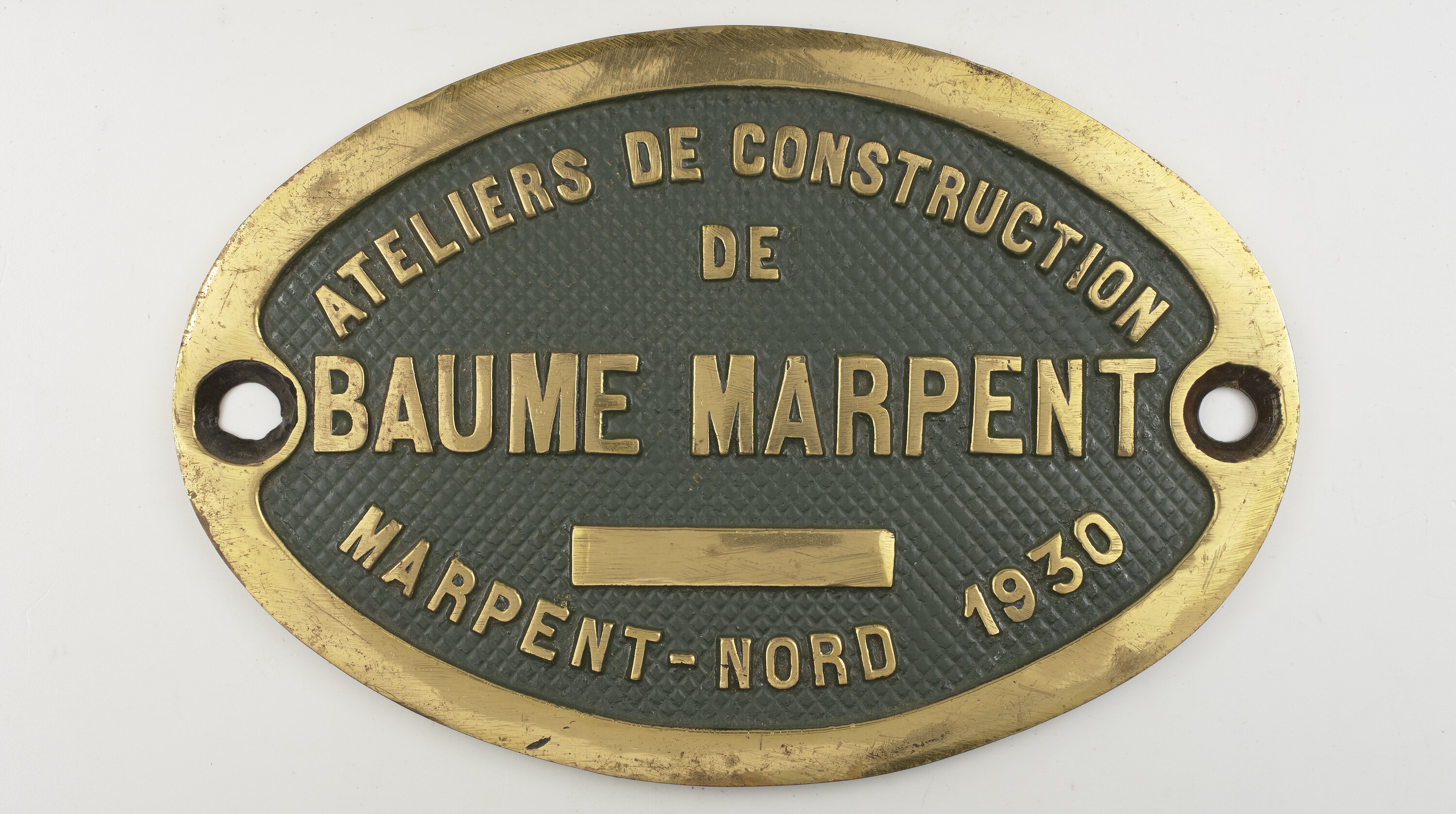 Brass oval locomotive builders plate, manufactured by Baume & Marpent, Marpent, France, 1930.