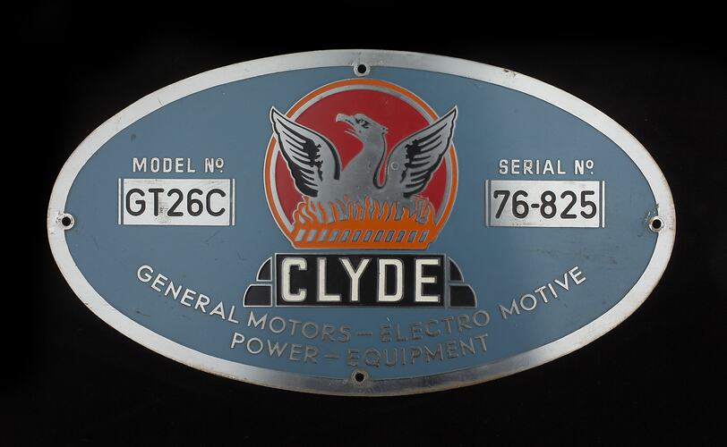 Oval locomotive builders plate, Model GT26C, Serial No. 76-825, manufactured by the Clyde Engineering Co. Ltd., Rosewater Works, South Australia in 1976.