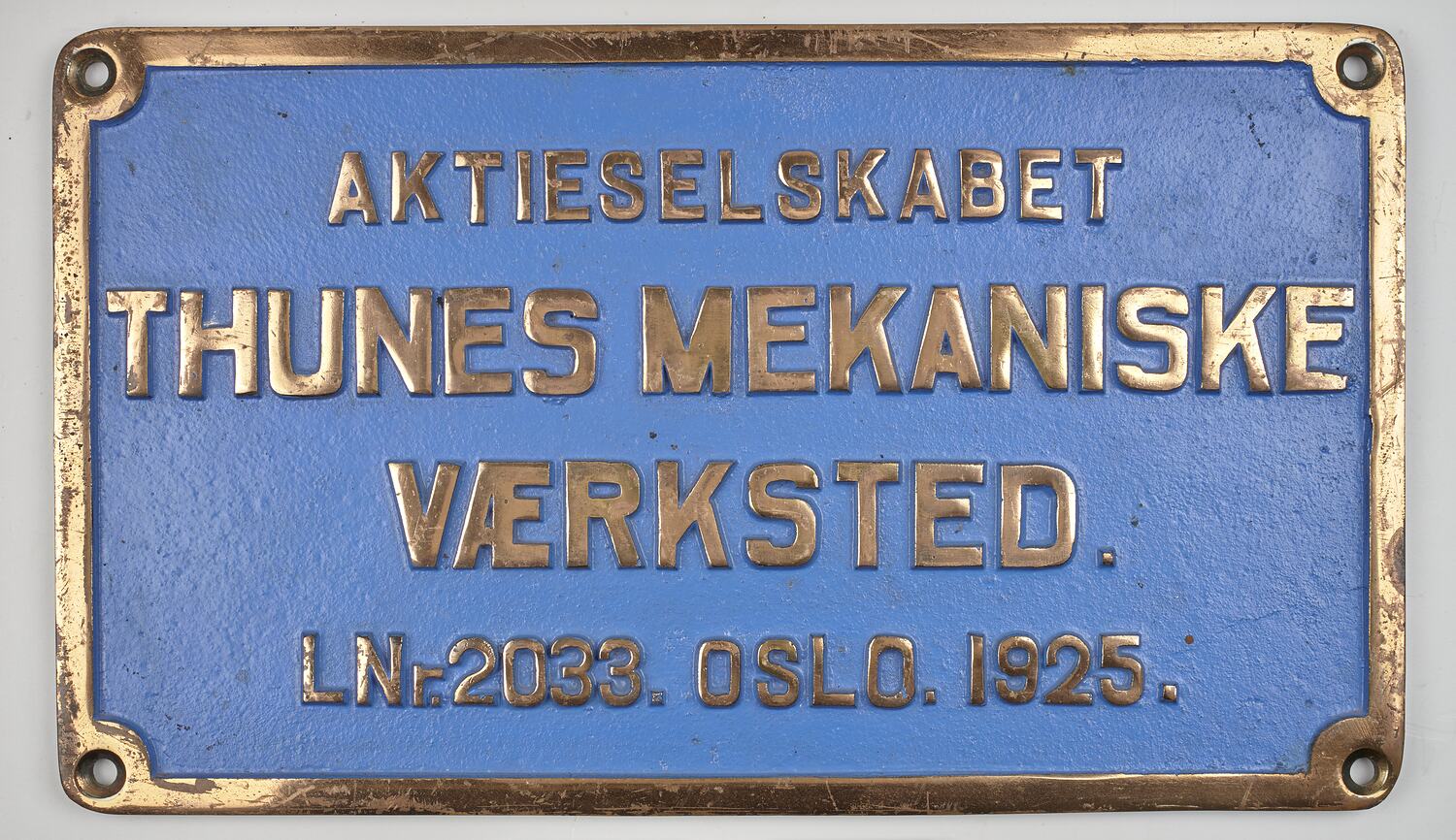 Aktieselskabet Thunes Mekaniske Vaerksted. L. Nr.2033. Oslo. 1925.