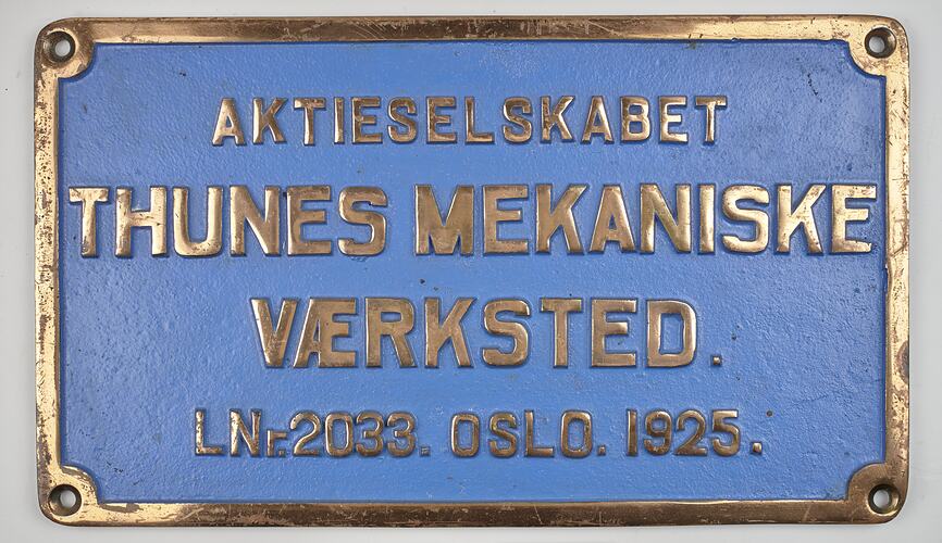 Cast iron rectangular locomotive builders plate, No. 2033, manufactured by Thunes Mekaniske Vaerksted Aktieselskabet, Oslo in 1925.