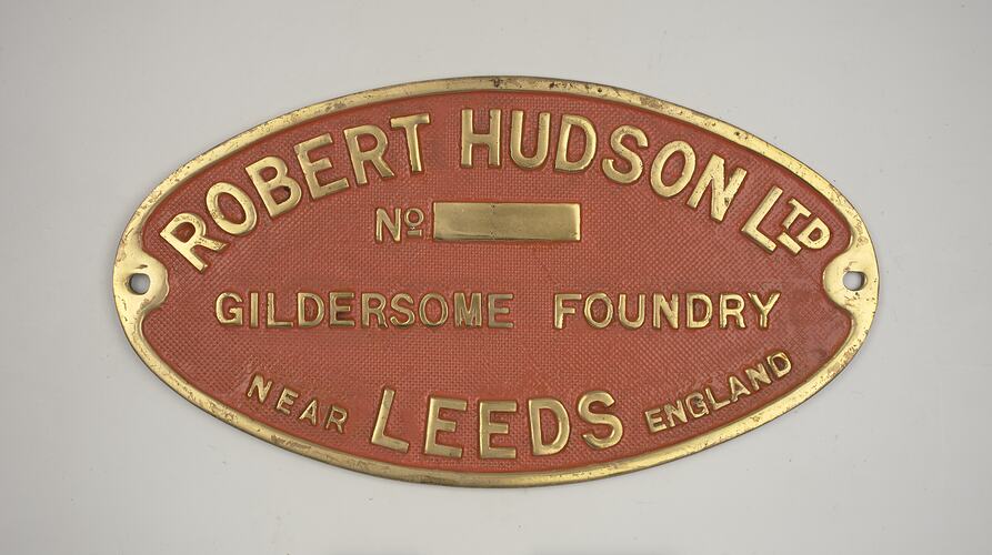 Brass oval locomotive builders plate, manufactured by Robert Hudson Ltd, Gildersome Foundry, Leeds, England.