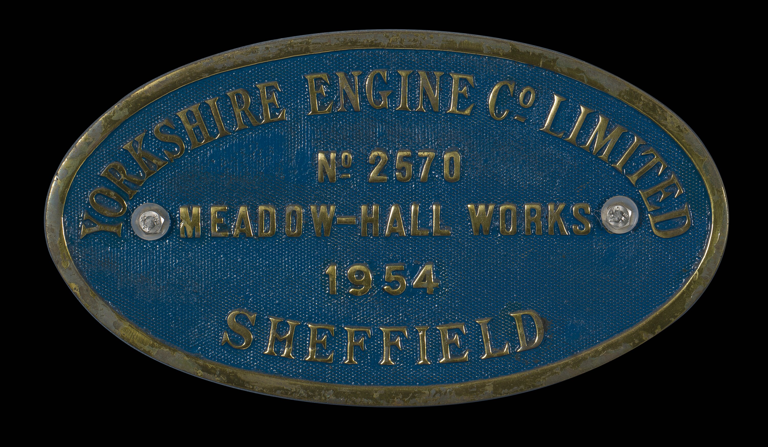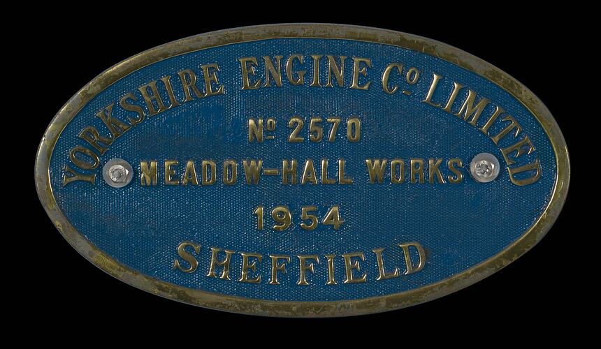 Brass oval locomotive builders plate, No. 2570, manufactured at Yorkshire Engine Co. Ltd., Meadow-Hall Works, Sheffield, 1954