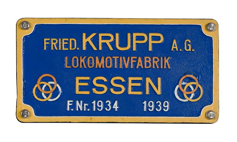 White metal rectangular locomotive builders plate, F. NR. 1934, manufactured by Friedrich Krupp AG, Essen, Germany in 1939.