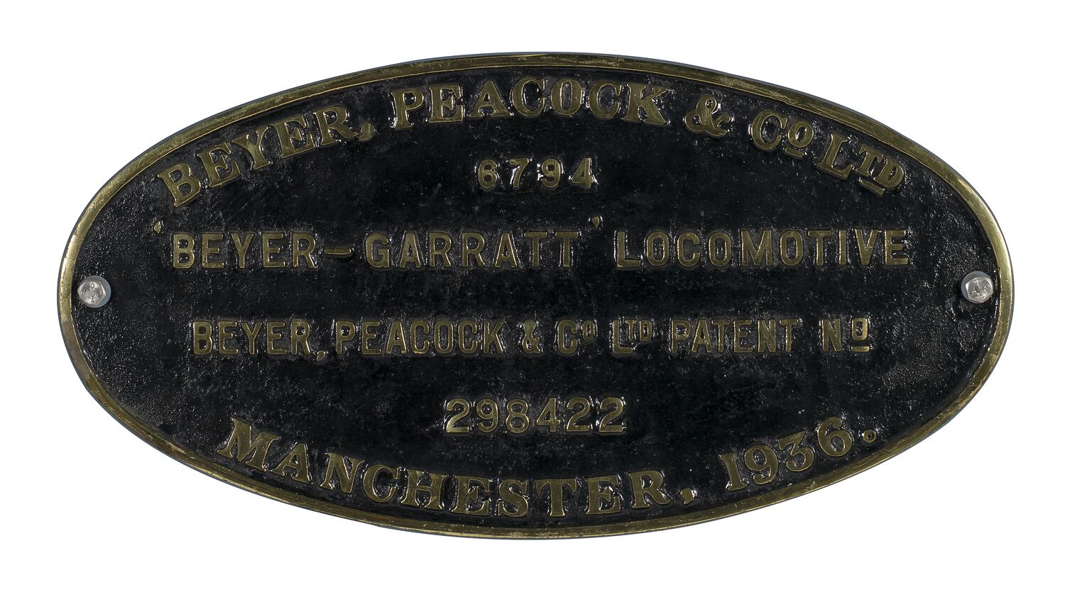 Brass oval locomotive builders plate, No. 6794, manufactured by Beyer Peacock & Co. Ltd., Manchester in 1936.