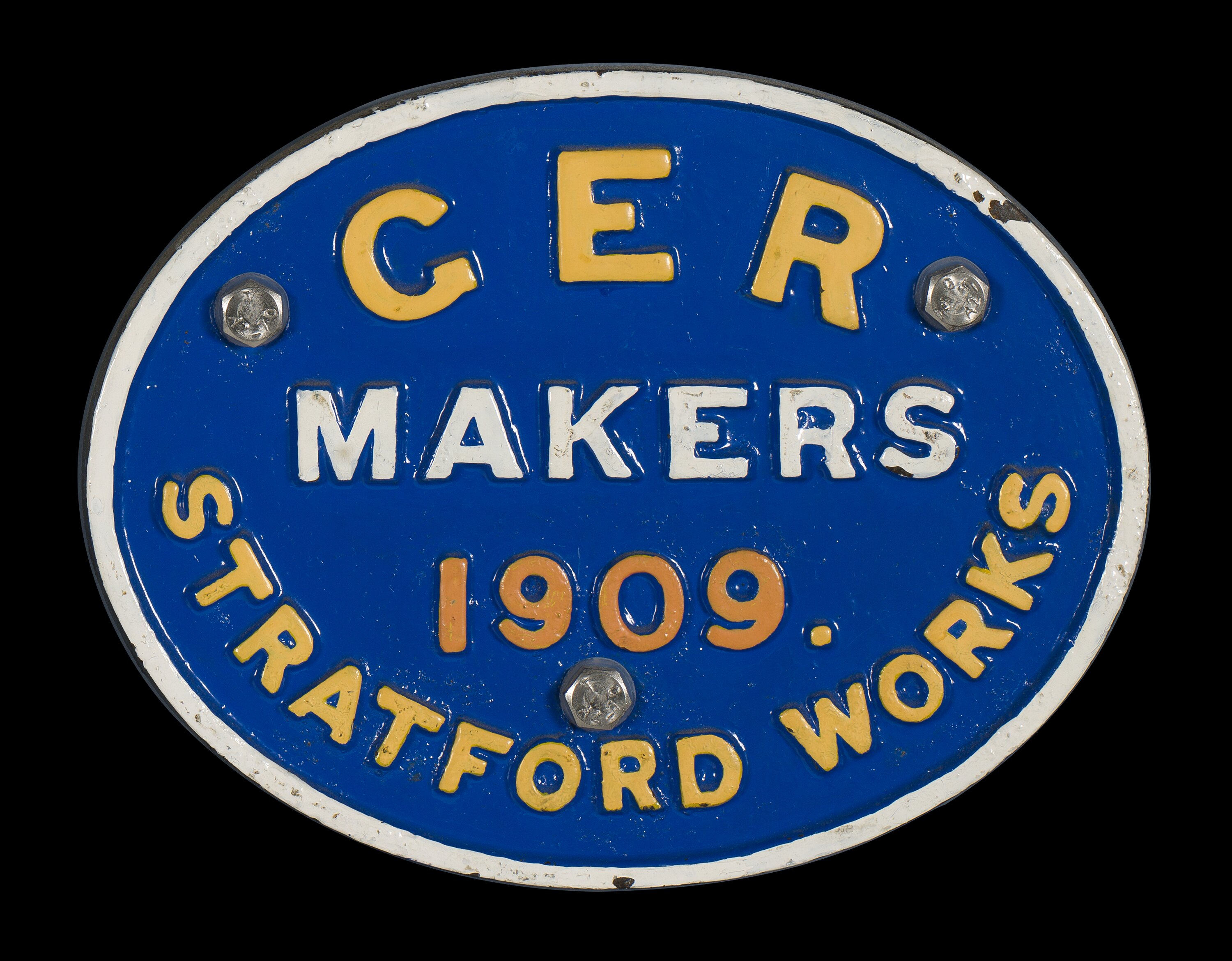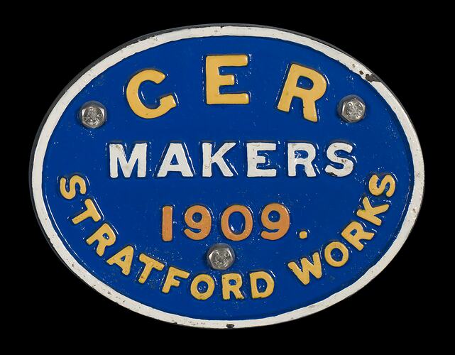 Brass oval locomotive builders plate, manufactured by Great Eastern Railway, Stratford Works, Stratford, England, 1909.